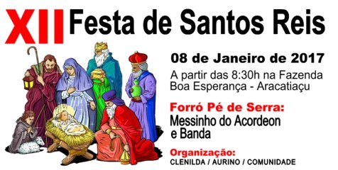 A comunidade de Fazenda Boa Esperança e Lagoa da Cruz – Aracatiaçu, há onze anos vem realizando a Festa de Santos Reis, que é uma manifestação cultural de resgate a cultura popular. Este ano vem com a sua 12ª Edição, que acontecerá no dia 08 de Janeiro de 2017, a partir das 20:30h, na Fazenda Boa Esperança. O evento tem como objetivo resgatar e valorizar a cultura popular, com o repasse dos saberes e fazeres de gerações como forma de manter viva a nossa cultura.