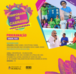 Dando continuidade à Temporada de Carnaval #OcupaSobral 2017, o tradicional desfile do Bloco dos Sujos acontecerá neste sábado (18/02). Puxada pelos artistas ‘Renne Django’, ‘Chico Pessoa e Banda’ e ‘Bloco Iracema Bode Beat; com Nayra Costa (ex The Voice), Daniel Groove e Aldo Sena’, a folia comemorará 71 anos de tradição e concentrará os foliões na Praça da Coluna da Hora, a partir das 17h, seguindo pelo percurso que se encerra no Boulevard do Arco.