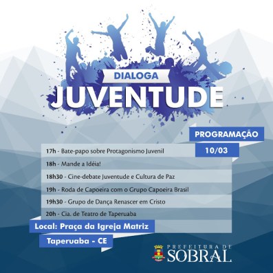 Inúmeras atividades educativas voltadas à participação social e protagonismo juvenil serão ofertadas gratuitamente, nesta sexta-feira (10/02), a partir das 17h, na Praça Matriz do distrito de Taperuaba. “Com o intuito de aproximar a comunidade de Taperuaba dos serviços ofertados pela gestão, o ‘Dialoga Juventude’ pretende ouvir os jovens e conhecer suas demandas e necessidades para a elaboração das ações que serão desenvolvidas para o fortalecimento do protagonismo juvenil e fomento da participação social,” informou o coordenador de Juventude de Sobral, Victor Ponte.3