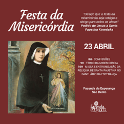 A Fazenda da Esperança São Bento realiza neste domingo, dia 23, a Festa da Misericórdia, celebrada pela Igreja Católica Romana em todo o mundo, no segundo domingo da Páscoa. A devoção teve início com a santa polonesa Faustina Kowalska, religiosa canonizada pelo então Papa João Paulo II. Em seu Diário, a Santa relata as instruções que recebeu de Jesus Cristo, através de aparições, para que desse a conhecer ao Mundo a Sua Misericórdia.