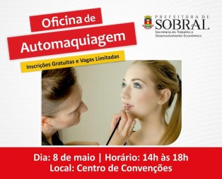 A Prefeitura de Sobral, por meio da Secretaria do Trabalho e Desenvolvimento Econômico (STDE), está com inscrições abertas para a oficina gratuita de automaquiagem. As inscrições poderão ser feitas até o dia 5 de maio, na STDE, localizada no Centro de Convenções de Sobral.
