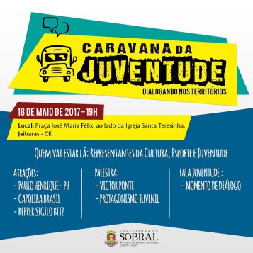 Os moradores do distrito do Jaibaras receberão, nesta quinta-feira (18/05), a partir das 19h, a Caravana da Juventude. Serão oferecidos à população acesso aos mais variados atendimentos, como