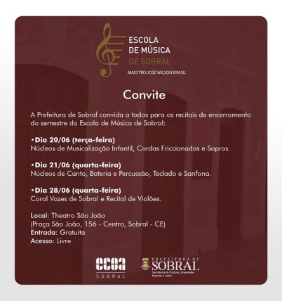 Durante os dias 20, 21 e 28 de junho, os alunos da Escola de Música de Sobral realizarão, no Theatro São João, concertos musicais em comemoração ao encerramento das aulas do primeiro semestre do ano de 2017.