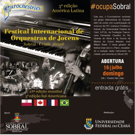 Com o objetivo de promover o intercâmbio cultural e artístico por meio da prática orquestral desenvolvida por jovens músicos de 15 a 25 anos, o Festival Internacional de Orquestras Jovens – Eurochestries, acontecerá em Sobral, entre os dias 16 e 23 de julho. O festival, que já aconteceu em países como França, Espanha, Polônia, Eslováquia, Rússia e Canadá; volta a Sobral em sua terceira passagem pela América Latina. A abertura será realizada no próximo domingo (16/07), às 20h, no Theatro São João.