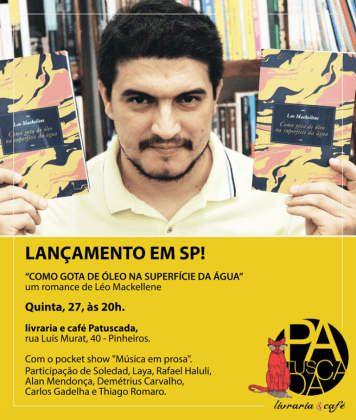 O professor do curso de Direito da Faculdade Luciano Feijão, músico na Banda Trovador Eletrônico e escritor Léo Mackellene lança nesta quinta-feira, 27 de julho, em São Paulo, seu mais novo livro “Como gota de óleo na superfície da água”. O evento com direito a sessão de autógrafos e pocket show acontecerá na livraria e café Patuscada, no bairro de Pinheiros.