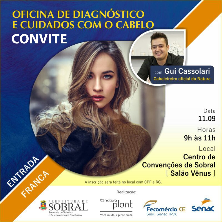 A Prefeitura de Sobral, por meio da Secretaria do Trabalho e Desenvolvimento Econômico (STDE), Natura, Fecomércio e SENAC, realizarão, na próxima segunda-feira (11/09), às 9h, no Centro de Convenções (Salão Vênus), uma Oficina de Diagnóstico e cuidados com o cabelo, que será ministrada por Gui Cassolari, cabeleireiro oficial da Natura. Os interessados em participar da oficina, deverão comparecer no dia da oficina portando CPF e RG. Entrada gratuita.