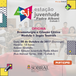 A Secretaria da Cultura, Juventude, Esporte e Lazer (Secjel), por meio da Estação Juventude Padre Albani (Cohab I), está com inscrições abertas até o dia 08 de outubro, para a Oficina “Dramaturgia e Criação Cênica”. A atividade é gratuita e oferece vagas limitadas.
