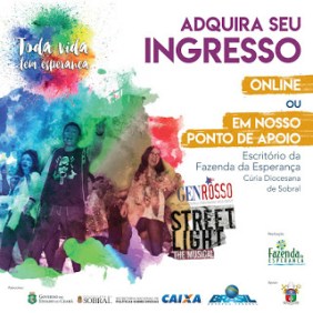 Já estão abertas as inscrições para o Espetáculo Street Light, que faz parte do Projeto Toda Vida Tem Esperança, organizado pela Fazenda da Esperança São Bento. Em duas apresentações, marcadas para os dias 10 e 11 de novembro, no Ginásio Poliesportivo Dr Plínio Pompeu, o musical é encenado pelo grupo internacional Gen Rosso, do Movimento dos Focolares, juntamente com centenas de jovens em recuperação na comunidade terapêutica. Na edição da turnê em Sobral, são esperados mais de 300 jovens das fazendas do Rio Grande do Norte, Paraíba, Pernambuco e Ceará.
