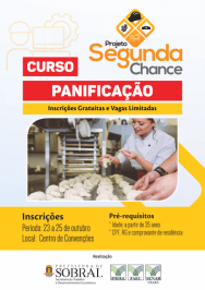 Como parte do projeto Segunda Chance, a Prefeitura de Sobral, por meio da Secretaria do Trabalho e Desenvolvimento Econômico (STDE), em parceria com o Sindicato Rural de Sobral e do Sistema FAEC/SENAR, estão com inscrições abertas, de 23 a 25 de outubro, para o curso de Panificação. Os interessados, além de possuir a idade mínima de 35 anos, deverão comparecer ao Centro de Convenções, localizado na Rua Visconde de Sabóia, Nº300 – Junco, portando cópias do RG, CPF e comprovante de residência. As inscrições são gratuitas e as vagas limitadas.