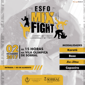 A Prefeitura de Sobral, por meio da Secretaria da Cultura, Juventude, Esporte e Lazer (Secjel), e da Escola de Formação Olímpica (Esfo), irá promover, a partir das 15h deste sábado (02/12), na Vila Olímpica de Sobral, o I Esfo Mix Figth. A competição irá envolver alunos atletas com disputas nas modalidades de Karatê, Boxe, Jiu-jitso e Capoeira.