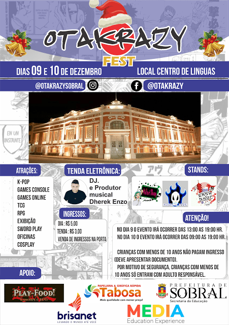 Seguindo a proposta do #OcupaSobral, o Palácio de Ciências e Línguas Estrangeiras de Sobral sediará, nos dias 9 e 10 de dezembro, o Otakrazy Fest, evento de cultura oriental, que reúne o público Geek, Nerd e Otaku. A partir das 13h do sábado, terão início as atividades com atrações K-pop, games consoles, games online, TCG, RPG, exibição, Sword Play (esporte que simula uma batalha medieval), oficinas, cosplay, tenda eletrônica com DJ e stands.