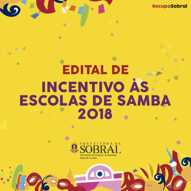 A Prefeitura de Sobral, por meio da Secretaria da Cultura, Juventude, Esporte e Lazer (Secjel), torna pública a realização do edital nº 001/2018 de Incentivo às Escolas de Samba de Sobral, cujo objetivo é credenciar e apoiar os projetos de montagem e apresentação de espetáculos carnavalescos, com o intuito de compor a programação da Temporada de Carnaval #ocupaSobral 2018.