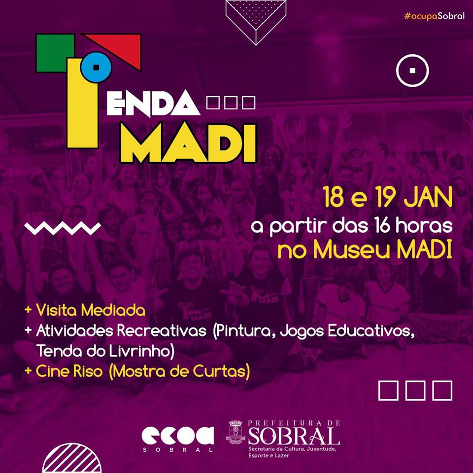 A Prefeitura de Sobral, por meio da Secretaria da Cultura, Juventude, Esporte e Lazer (Secjel) e da Escola de Cultura, Comunicação, Ofícios e Artes (ECOA), promove mais uma edição do projeto Tenda Madi, nos dias 18 e 19 de janeiro (quinta e sexta-feira), a partir das 16 horas. O objetivo é proporcionar uma maior interação entre a comunidade local e o acervo que deu origem ao primeiro museu MADI do Brasil.