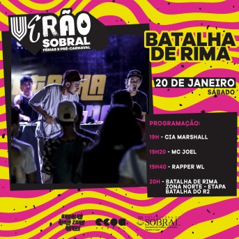 Como parte da programação do “Verão Sobral”, ocorre, neste sábado (20/01), a Batalha do R2. O evento voltado para o público que curte o Hip Hop e suas diversas vertentes marca a primeira etapa do circuito de batalha de rima da Zona Norte e será realizado na Praça da Estação da Juventude do bairro Recanto II, às 19 horas. Vários Mc’s se encontrão num circuito de batalhas de rimas com rodada livre de Freestyle.
