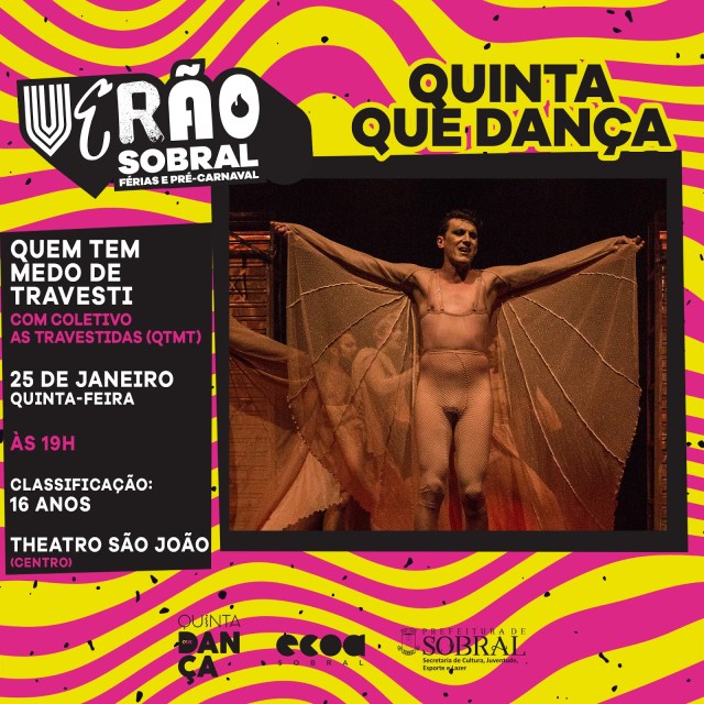O programa Quinta com Dança, especial “Verão Sobral”, apresenta, nesta quinta-feira (25/01), o espetáculo “Quem tem medo de travesti”, trabalho do coletivo artístico As Travestidas (Fortaleza), que consiste em uma pesquisa continuada de investigação sobre o universo “Trans” no Brasil.