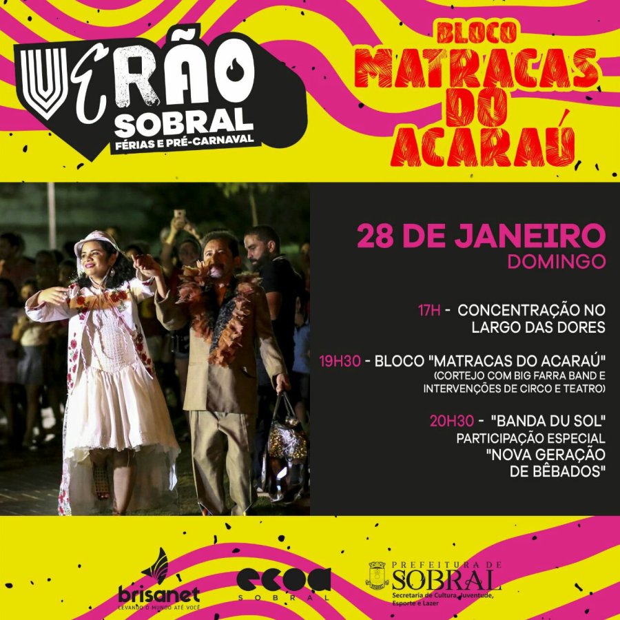 E em sua última edição no “Verão Sobral”, o Bloco Matracas do Acaraú deste domingo (28), terá concentração a partir 17h, no Largo das Dores, com os personagens tradicionais do Bloco, os artistas circenses Nik Coelho Alexandre, Mayara Leal, Emanuel Cruz e Joceli Ferreira, e Big Farra Band com sons que vão do Frevo ao Jazz Pop.
