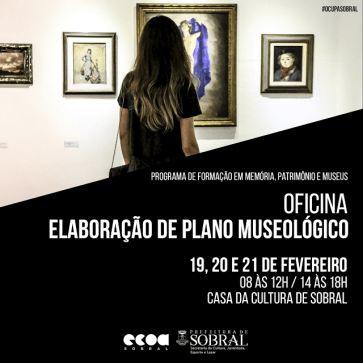 Integrando o Programa de Formação em Memória, Patrimônio e Museus, a Prefeitura de Sobral, por meio da Secretaria da Cultura, Juventude, Esporte e Lazer (Secjel) e da Escola de Cultura, Comunicação, Ofícios e Artes (Ecoa), promove durante os dias 19, 20 e 21 de fevereiro, na Casa da Cultura de Sobral, oficina de Elaboração de Plano Museológico.