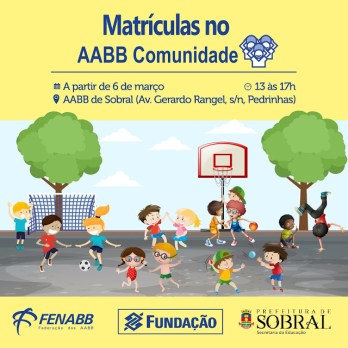 A Secretaria da Educação de Sobral abrirá, a partir do dia 6 de março, as matrículas de alunos no Programa Integração AABB Comunidade. São oferecidas 115 vagas para estudantes matriculados na rede pública municipal de educação, com idade entre 6 e 12 anos, que poderão ter aulas de natação, futebol, futsal, vôlei, basquete, handebol, dança e apoio pedagógico.