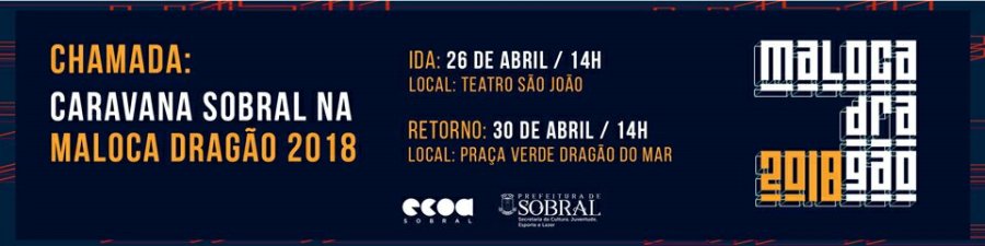Percebendo a importância da presença de grupos, produtores, artistas e agentes culturais da cidade de Sobral, a Secretaria da Cultura, Juventude, Esporte e Lazer, através do Instituto ECOA Sobral, abre inscrições para a Caravana Sobral na Maloca, oportunizando translado para os interessados, com o objetivo de gerar trocas de experiências, saberes e conhecimentos sobre o mundo da música, produção cultural, técnicas e apreciação de uma panorama da arte cearense. As inscrições seguem abertas até 15 de abril (domingo). APROVEITE!