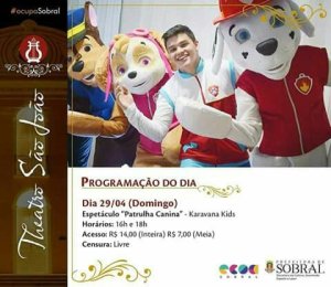 Salve galerinha boa! Se liga no espetáculo infantil que o Theatro São João receberá no próximo dia 29 de abril (domingo). Vem aí Patrulha Canina Cover. Serão duas sessões exclusivas pra criançada curtir. A primeira às 16h e a segunda às 18h. Não fique de fora!