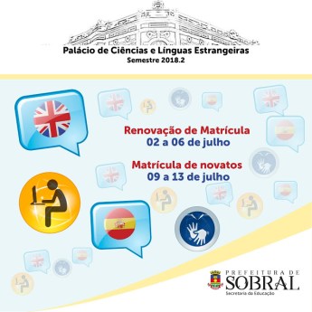 O Palácio de Ciências e Línguas Estrangeiras realizará, de 09 a 13 de julho, as inscrições na seleção para os cursos de Inglês, Espanhol, Informática e Libras para o semestre de 2018.2. São oferecidas 760 vagas para estudantes, gestores, professores e demais interessados. As inscrições serão realizadas exclusivamente, pela internet, por meio do preenchimento de formulário eletrônico. A renovação de matrícula dos alunos veteranos será realizada de 2 a 6 de julho.