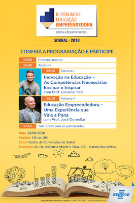Os professores das escolas públicas municipais devem realizar a inscrição, clicando aqui. Na programação, haverá uma palestra sobre a “Inovação na educação – As competências necessárias ensinar e inspirar”, com o Prof. Gustavo; e outra palestra proferida pelo professor José Dornellas sobre “Educação empreendedora – Uma experiência que vale a pena”, além de um talk-show com os dois palestrantes.