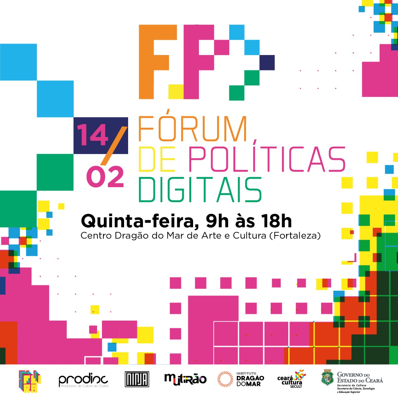 A Secretaria da Cultura do Estado do Ceará (Secult), a Secretaria da Ciência, Tecnologia e Educação Superior (Secitece), a Feira da Música e o Mutirão convidam para o Fórum de Políticas Digitais que acontece no