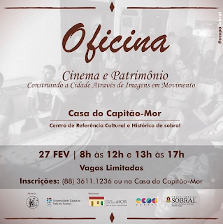 Com o intuito de discutir as relações entre o cotidiano na cidade e sua percepção através de imagens em movimento, a Casa do Capitão-Mor José Xerez Furna Uchôa em parceria com a Universidade Estadual Vale do Acaraú – UVA, apresenta a oficina “Cinema e Patrimônio: Construindo a Cidade através de Imagens em Movimento”. Facilitado pelo Grupo Câmera da Peste, o encontro acontece no dia 27 de fevereiro, das 08h às 12h e 13h às 17h, na Casa do Capitão-Mor. Os interessados em participar devem se inscrever gratuitamente através do site: