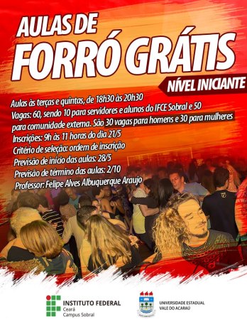 Olha que novidade boa! O IFCE Sobral oferecerá aulas de forró gratuitas através de um projeto de extensão do professor Felipe Albuquerque. As aulas serão nas noites de terças e quintas-feiras, no Memorial da Educação Superior de Sobral, por meio de uma parceria com a UVA.