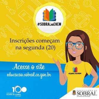 Começaram na segunda-feira (20/05) as inscrições para #SobralnoEnem 2019. O curso preparatório para o Exame Nacional do Ensino Médio é voltado para estudantes do 3° ano do ensino médio e egressos, que residem no município de Sobral. Os interessados devem realizar a inscrição online até o dia 31 de maio.