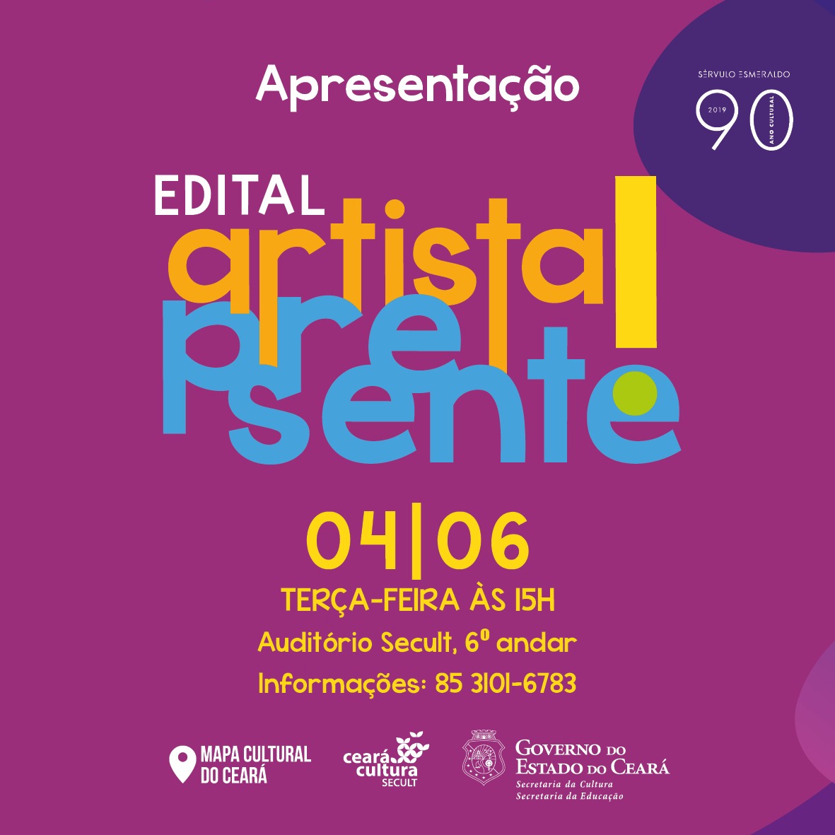 A Secretaria da Cultura do Estado do Ceará (Secult) e a Secretaria da Educação do Ceará (Seduc) convidam para a apresentação do projeto “Artista, Presente!” – o edital tem por objetivo aproximar artistas de diversas linguagens e campos de criação do ambiente escolar da rede estadual de ensino, impulsionando outros modos de experimentar, conhecer e produzir em artes. A apresentação do projeto (momento para tirar dúvidas e para mobilizar) acontece no dia 4 de junho, às 15h, no Auditório da Secult (6º andar – Rua Major Facundo, 550).