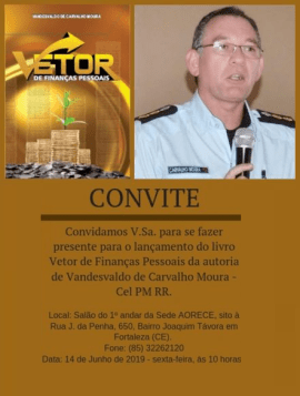 O coronel PM Vandesvaldo Carvalho lança na manhã da próxima sexta-feira (14), na Associação dos Oficiais Militares da Reserva e Reformados PM/BM do Estado do Ceará (Aorece), no bairro Joaquim Távora, o livro Vetor de Finanças Pessoais.