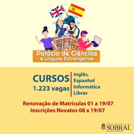 A Secretaria da Educação de Sobral divulgou o edital de renovação de matrícula e inscrições para novatos nos cursos de Inglês, Espanhol, Informática e libras do Palácio de Ciências e Línguas Estrangeiras. São oferecidas 1.223 vagas para estudantes, gestores, professores e demais interessados. De 1° a 19 de julho será o período de renovação de matrícula dos veteranos. As matrículas dos alunos novatos serão realizadas de 8 a 19 de julho, exclusivamente, pela internet por meio de formulário eletrônico.