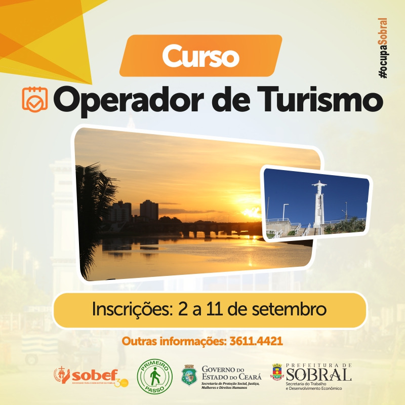A Prefeitura de Sobral, por meio da Secretaria do Trabalho e Desenvolvimento Econômico (STDE), abre as inscrições para o curso de Operador de Turismo nesta segunda-feira (02/09). Ele é voltado para jovens de 15 a 29 anos, oriundos da rede pública, que estejam cursando o 8º ano do Ensino Fundamental ou Médio. As inscrições seguem até dia 11 de setembro e as vagas são limitadas.