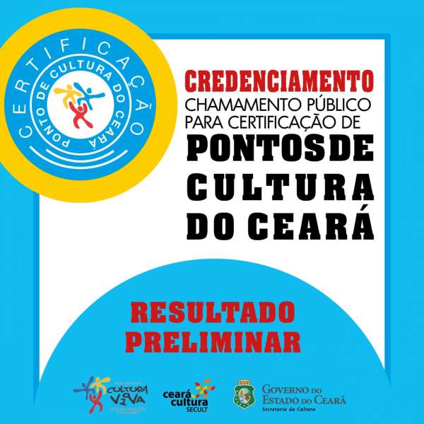 A Secretaria da Cultura do Estado do Ceará (Secult) divulga, nesta segunda-feira, 3/2, o Resultado Preliminar da Avaliação e Seleção da Proposta do Chamamento Público para Certificação de Entidades e Coletivos Culturais como Pontos de Cultura do Estado do Ceará.