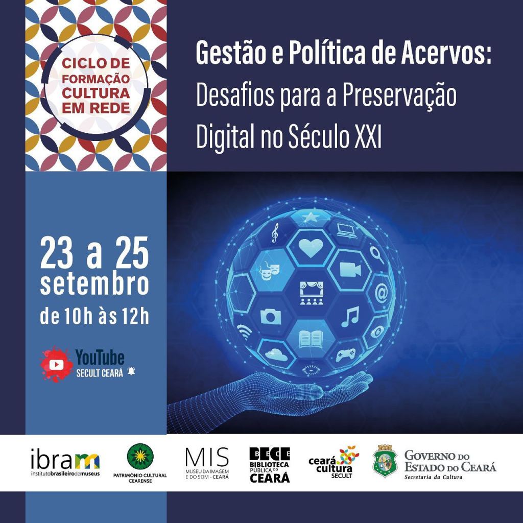 Secult Ceará convida vocês para o Ciclo de Formação Cultura em Rede, que tem como temática a “Gestão e Política de Acervos: desafios para a preservação digital no século XXI” e pretende discutir questões relacionadas à preservação, descarte e difusão de acervos diante das constantes inovações tecnológicas que impactam na gestão das coleções museais, conjuntos documentais e demais espécies de acervos das diferentes instituições voltadas à salvaguarda dos bens culturais materiais de nossa sociedade.