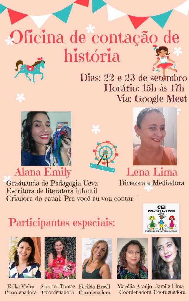 O Centro Educacional Infantil Dolores Lustosa realizará nos dias 22 e 23 de setembro, de 15 às 17h, a Oficina de Contação de História. O evento é livre e será disponibilizado via google meet. Mais informações na página do facebook cei.doloreslustosa.