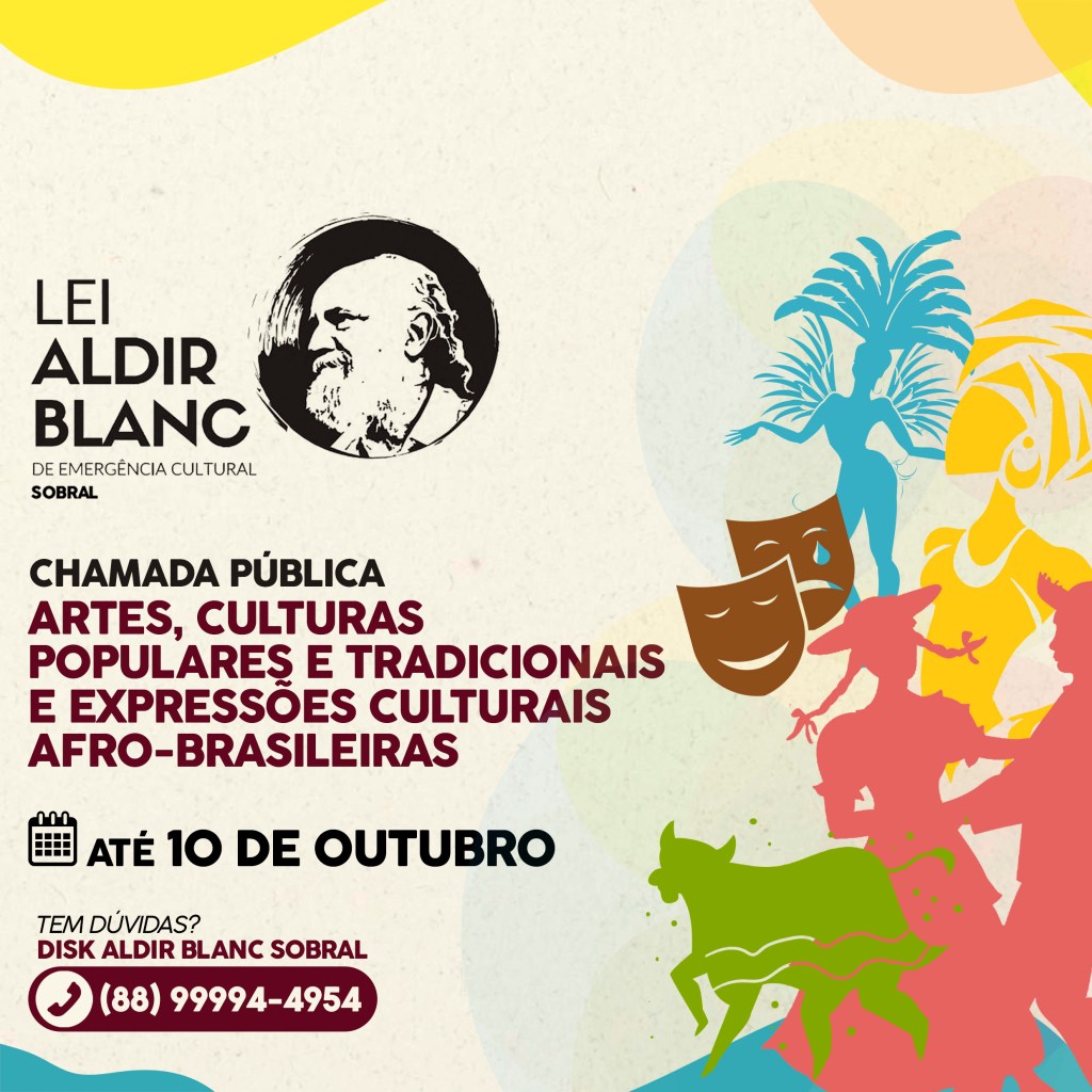 A Prefeitura de Sobral, por meio da Secretaria Municipal da Cultura, Juventude, Esporte e Lazer, torna pública a CHAMADA PÚBLICA PARA SELEÇÃO DE PROPOSTAS DE ATIVIDADES ARTÍSTICAS, objetivando o apoio e o subsídio de artistas e/ou grupos artísticos das áreas das ARTES CÊNICAS (TEATRO, CIRCO E DANÇA), MÚSICA, LITERATURA, ARTES VISUAIS, AUDIOVISUAL, CULTURAS PERIFÉRICAS, PATRIMÔNIO CULTURAL MATERIAL E IMATERIAL, FESTIVAIS E MOSTRAS, PRODUÇÃO CULTURAL, CULTURAS POPULARES E TRADICIONAIS E EXPRESSÕES CULTURAIS AFRO-BRASILEIRAS, visando a realização de programações culturais que possam ser transmitidas pela internet ou disponibilizadas por meio das redes sociais e outras plataformas digitais, em atendimento a Lei Aldir Blanc de Emergência Cultural.