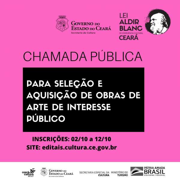 A Secretaria da Cultura do Estado do Ceará (Secult) divulga abertura de inscrições, nesta sexta-feira, dia 2 de outubro, no site http://editais.cultura.ce.gov.br/, de Chamada Pública referente à execução da Lei Aldir Blanc no Ceará, para apoio a projetos artísticos e culturais e a própria cadeia produtiva: Chamada Pública para Seleção e Aquisição de Obras de Arte de Interesse Público. As inscrições se iniciam no dia 2/10 e seguem até dia 12/10.