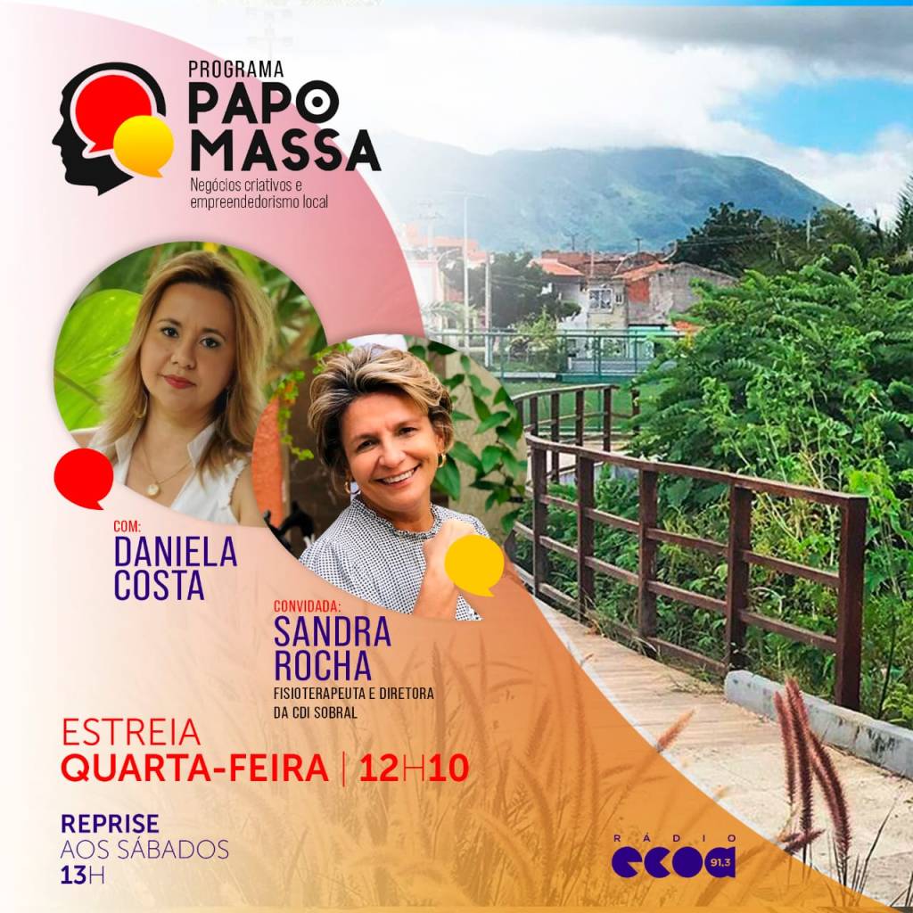Logo mais, às 12h10 vai ao ar a primeira edição do programa Papo Massa – Negócios Criativos e Empreendedorismo Local, comandado pela apresentadora, empresária e presidenta do Instituto Idetagro, Daniela Costa (Sobral). Neste primeiro programa recebemos a convidada Sandra Rocha, fisioterapeuta e diretora da CDI Sobral, para um bate-papo sobre a sua trajetória inspiradora no mundo dos negócios e da criatividade.