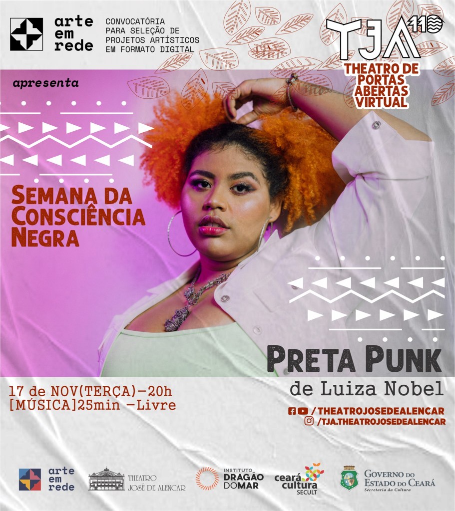 Dia 17/10 – Terça-Feira Theatro de Portas Abertas Virtual19h – [Gestão] Percurso das Pretas – Roda de Conversa com as atrizes Ana Marlene, Katiana Monteiro e Mara Raquel. Mediação: Yasmin Elica20h – [Música] Arte em Rede – Exibição do projeto “Preta Punk”, de Luiza Nobel 20h30 – Homenagem a Wellington RodriguesLocal: Youtube (/theatrojosedealencar)