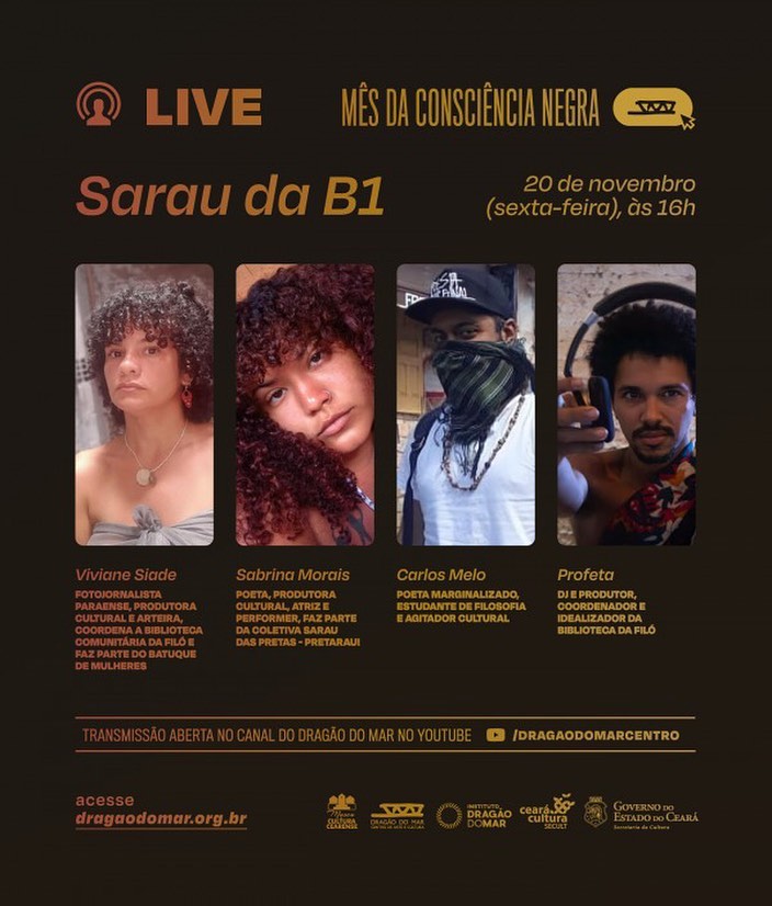 Integrando a programação do Centro Dragão do Mar de Arte e Cultura em alusão ao Dia da Consciência Negra, o Museu da Cultura Cearense exibirá, nesta sexta-feira (20), sarau virtual do coletivo Sarau da B1.