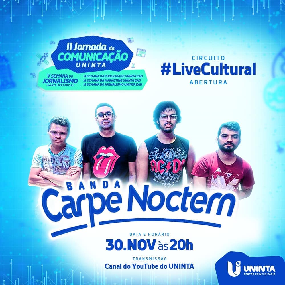 Na próxima segunda (30), a banda Carpe Noctem fará live, direto do Seletto Studios, na abertura da Jornada de Comunicação do Uninta, com transmissão pelo canal do Uninta no YouTube, às 20h – www.youtube.com/UnintaOficial