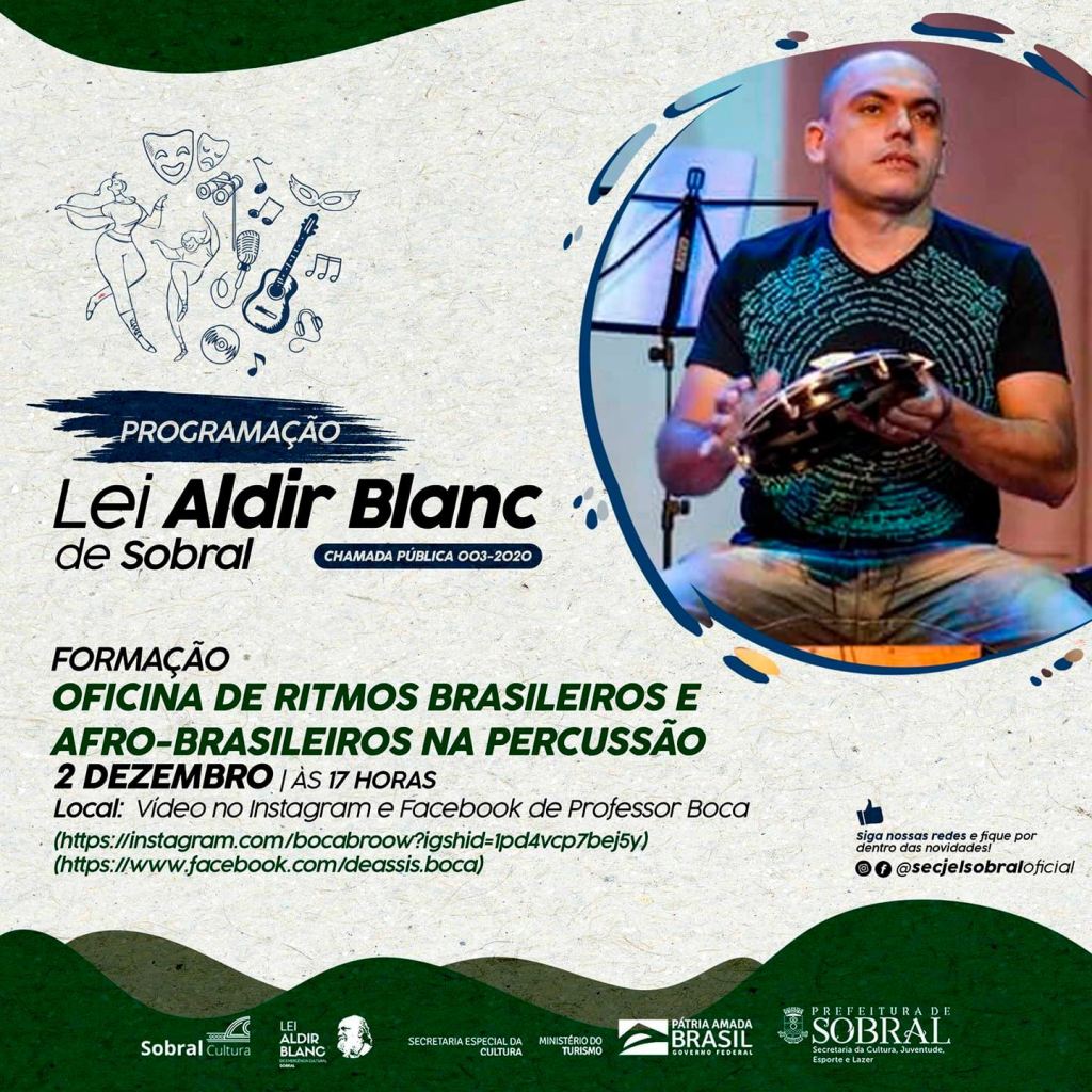 A formação é livre e estará disponível online a partir das 17h nas redes sociais (facebook.com/deassis.boca e instagram @bocabroow) para jovens, adultos e crianças a partir de 10 anos de idade interessados em conhecer ritmos afro-brasileiros e técnicas básicas relacionados aos instrumentos de percussão.