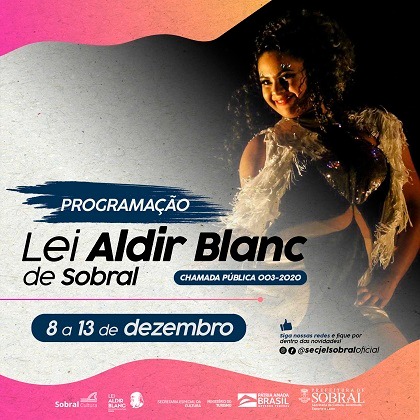 A Prefeitura de Sobral, divulgou, nesta sexta-feira (04/12), a programação da Lei Aldir Blanc que será realizada de 8 a 13 de dezembro. Durante todo este mês, acontecerão diversas formações, apresentações e lançamentos de obras artísticas e culturais, de forma on-line.