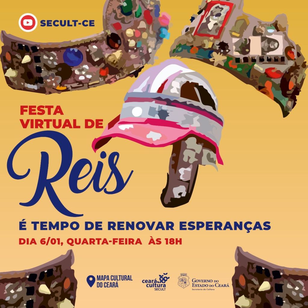 Secretaria da Cultura do Estado do Ceará (Secult), por meio da Coordenadoria de Patrimônio Cultural e Memória (Copam), convida a todos, todas e todes para a “Festa Virtual de Reis”, que acontece no dia 06 de janeiro, às 18h, no YouTube da Secult.