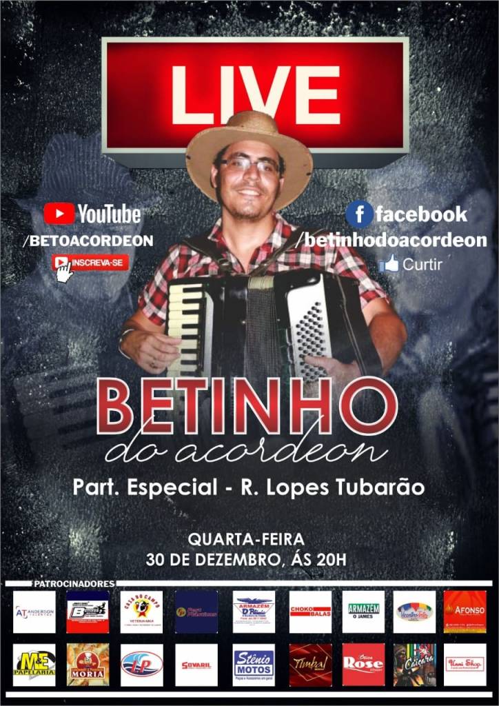 Nessa quarta-feira, dia 30 de dezembro, tem live do Betinho do acordeon, com participação de R. Lopes Tubarão. A transmissão começa às 20 horas pelo canal no YouTube (youtube.com/betoacordeon) e Facebook do Betinho do acordeon.