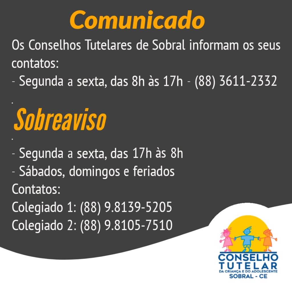 Os Conselhos Tutelares de Sobral informam à população que já estão atendendo em regime de sobreaviso, além do horário presencial. Para fazer denúncias ou para outros serviços, a população pode ligar para o número (88) 3611-2332, no horário comercial (8h às 17h, de segunda a sexta-feira). Das 17h até 8h da manhã seguinte (além dos sábados, domingos e feriados), os conselheiros podem ser acionados pelos números (88) 9.8139-5205 (Colegiado 1) e (88) 9.8105-7510 (Colegiado 2).