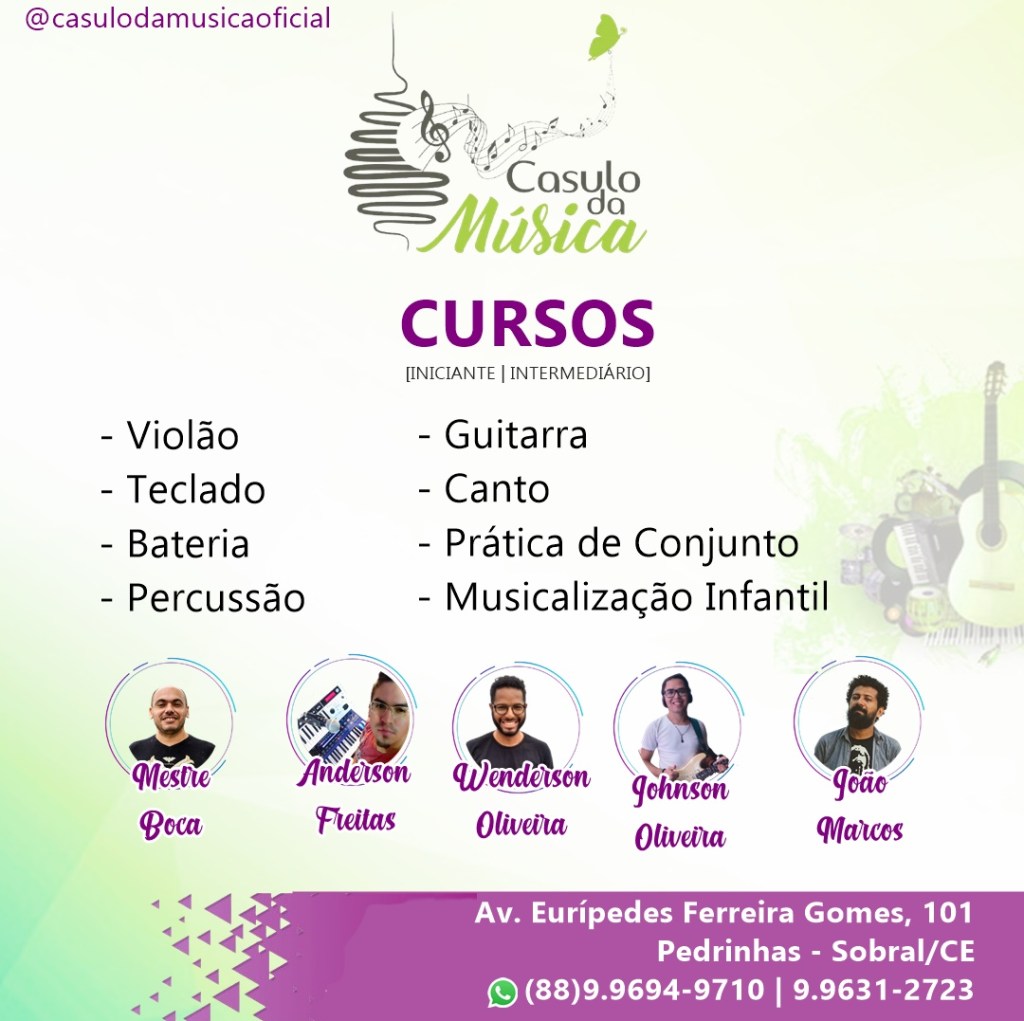 O espaço cultural Casulo da Música está com matrículas abertas para o primeiro semestre de 2021, estão sendo ofertadas vagas nos cursos de Bateria, Percussão, Violão, Teclado, Guitarra Elétrica, Canto, Prática de Conjunto e Musicalização Infantil.