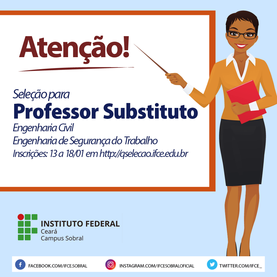O campus de Sobral do Instituto Federal do Ceará (IFCE) lançou edital para inscrições do processo seletivo para contratação de professores substitutos. A oferta são de duas vagas, sendo uma para a área de Engenharia Civil (subárea Agrimensura) e a outra para a área de Engenharia de Segurança do Trabalho (subárea Segurança do Trabalho). O contrato é por um ano, podendo ser prorrogado.